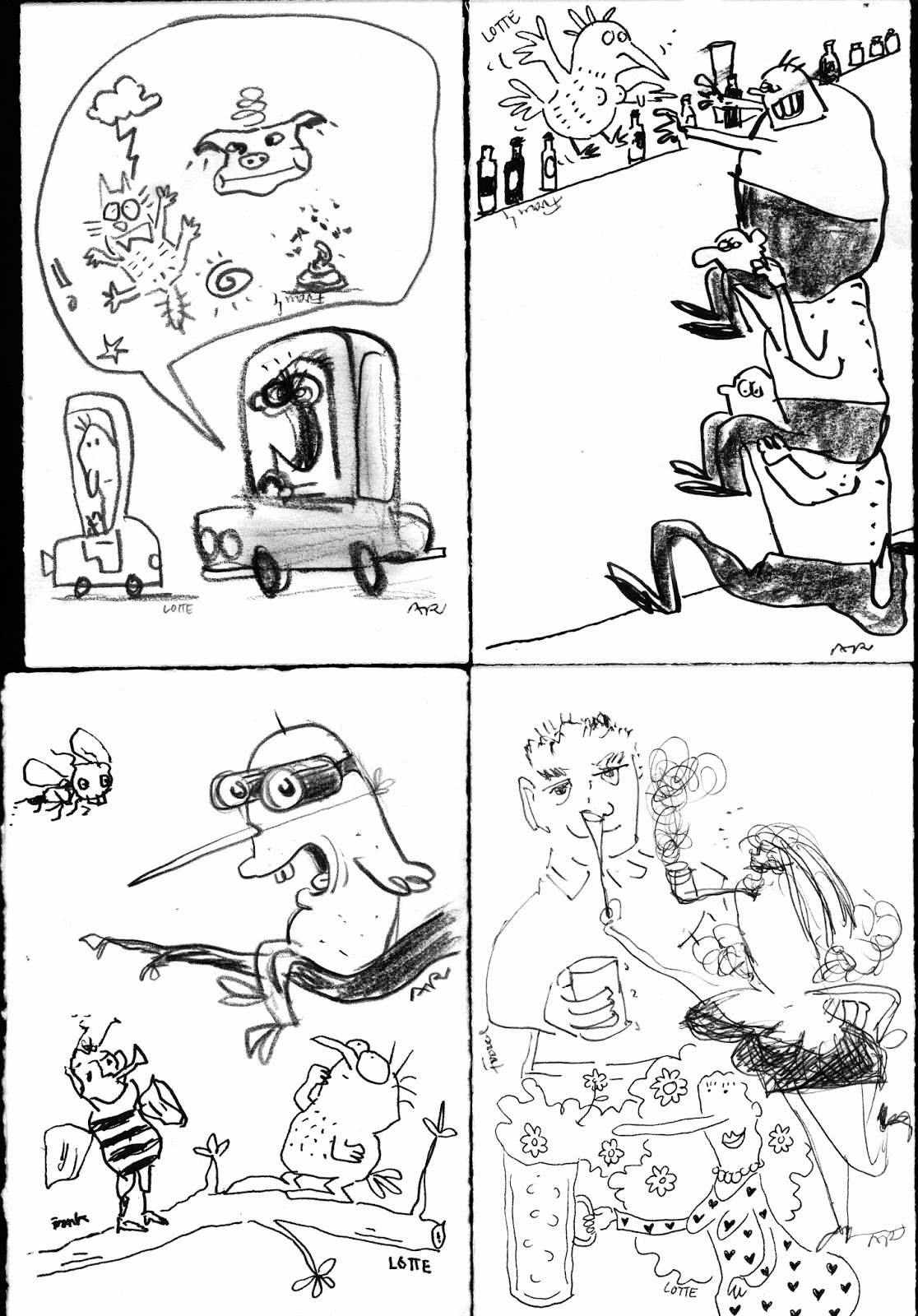 …das war das Ergebnis unseres Besuchs bei Frank daheim in Rendsburg. Ein lustiger Abend mit grafischen Lockerungsübungen, wie Karten kritzeln mit Links und mit Rechts und mit den unterschiedlichsten Werkzeugen. Vom Super-5 bis zum Pinselmarker war alles dabei. 2 Arme und eine Brille halten übrigens grade den Fotoapparat.Es grüßen herzlich,